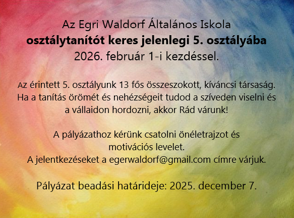 Az Egri Waldorf Általános Iskola osztálytanítót keres jelenlegi 5. osztályába 2026. február 1-i kezdéssel.